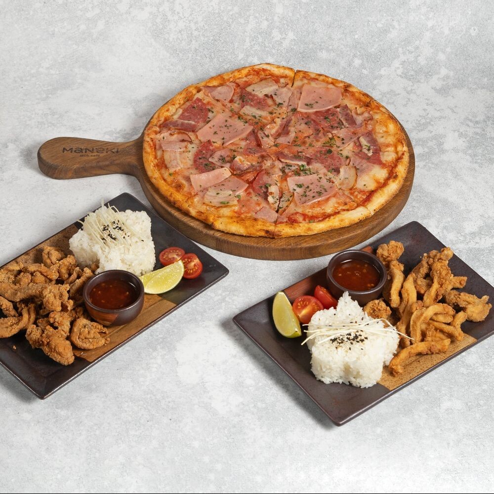 -Пицца Мясная (средняя): Ветчина, варено-копченый окорок, сырокопченый бекон, варено-копченая колбаса, моцарелла, соус из протертых томатов. Вес 670г. -Хрустящая курица с кисло-сладким чили соусом (2 порции): Филе куриного бедра, рис, черри, кисло-сладкий чили соус. Вес 570г.