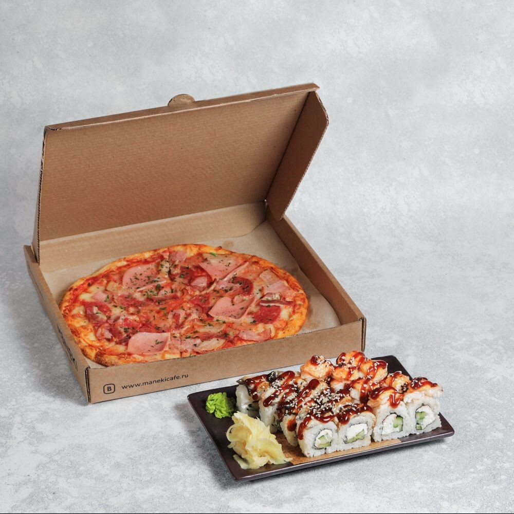 -Пицца Мясная (средняя): Ветчина, варено-копченый окорок, сырокопченый бекон, варено-копченая колбаса, моцарелла, соус из протертых томатов. Вес 410 г. - Филадельфия с угрем: Угорь, авокадо, огурец, сливочный сыр, соус терияки. Вес 210 г. - Запеченные сливочные роллы с креветками: Креветки, сурими, огурец, сливочный сыр, соусы: для запекания с тобико, терияки. Вес 240 г.