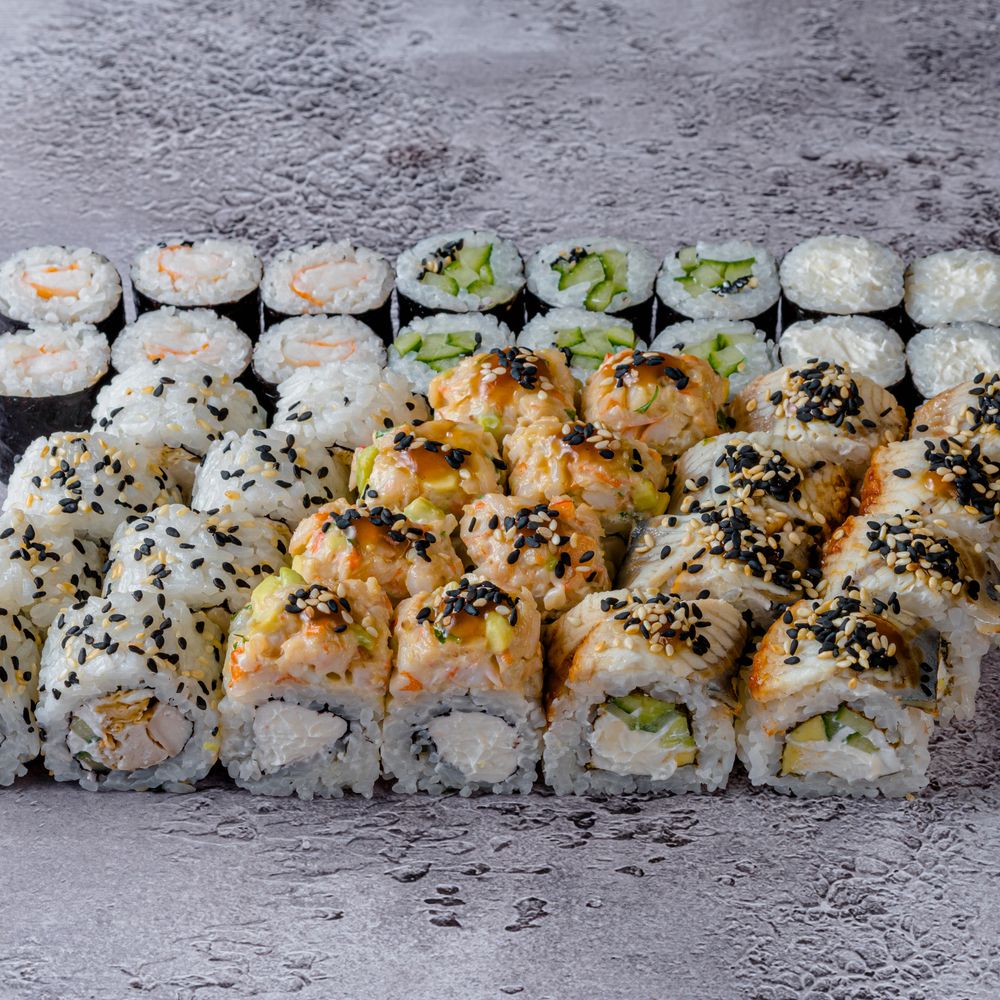С тартаром из креветок; Филадельфия с угрем; Осака; Маки с креветкой; Маки со сливочным сыром; Маки с огурцом (42 шт).
