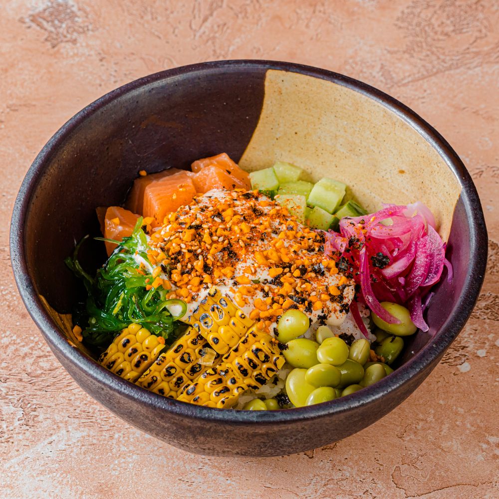 Лосось, бобы эдамаме, кукуруза, чука, огурцы, маринованный красный лук