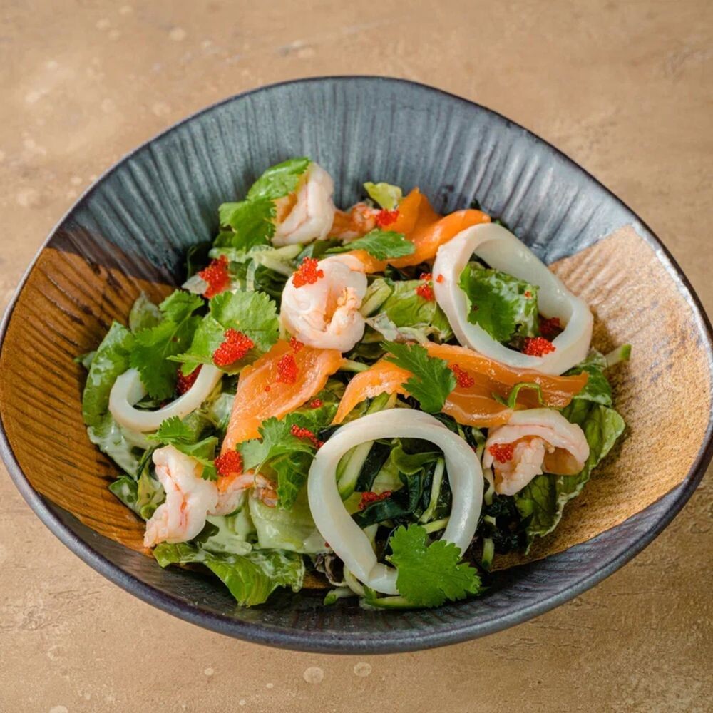 Лосось, креветки, кальмар, микс салатов, огурец, водоросли вакаме, тобико, кинза, сливочный соус васаби
