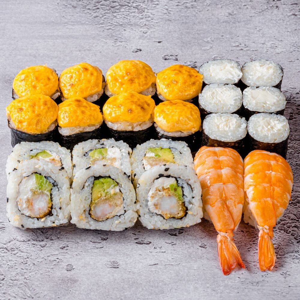 Запеченный с копченой курицей; Тоттори с креветками; Маки со сливочным сыром; Суши с креветкой (22 шт).