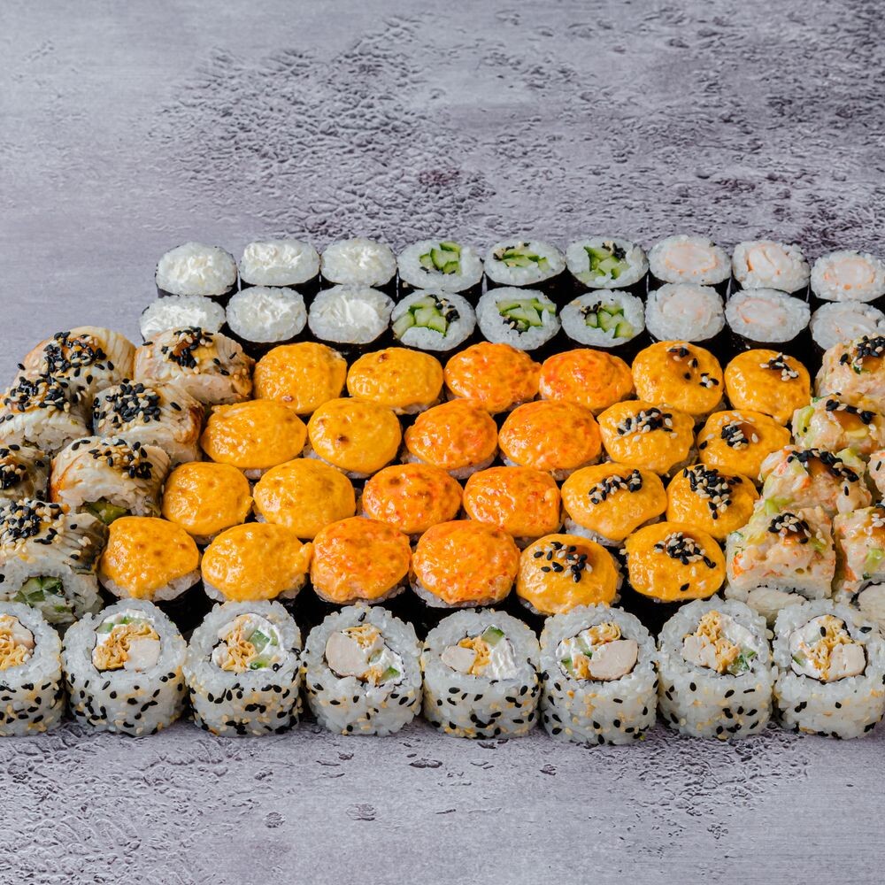 Запеченный с копченой курицей; Запеченный с сурими и тобико; Запеченный с окунем; Филадельфия с угрем; С тартаром из креветок; Осака; Маки с креветкой; Маки со сливочным сыром; Маки с огурцом (66 шт).