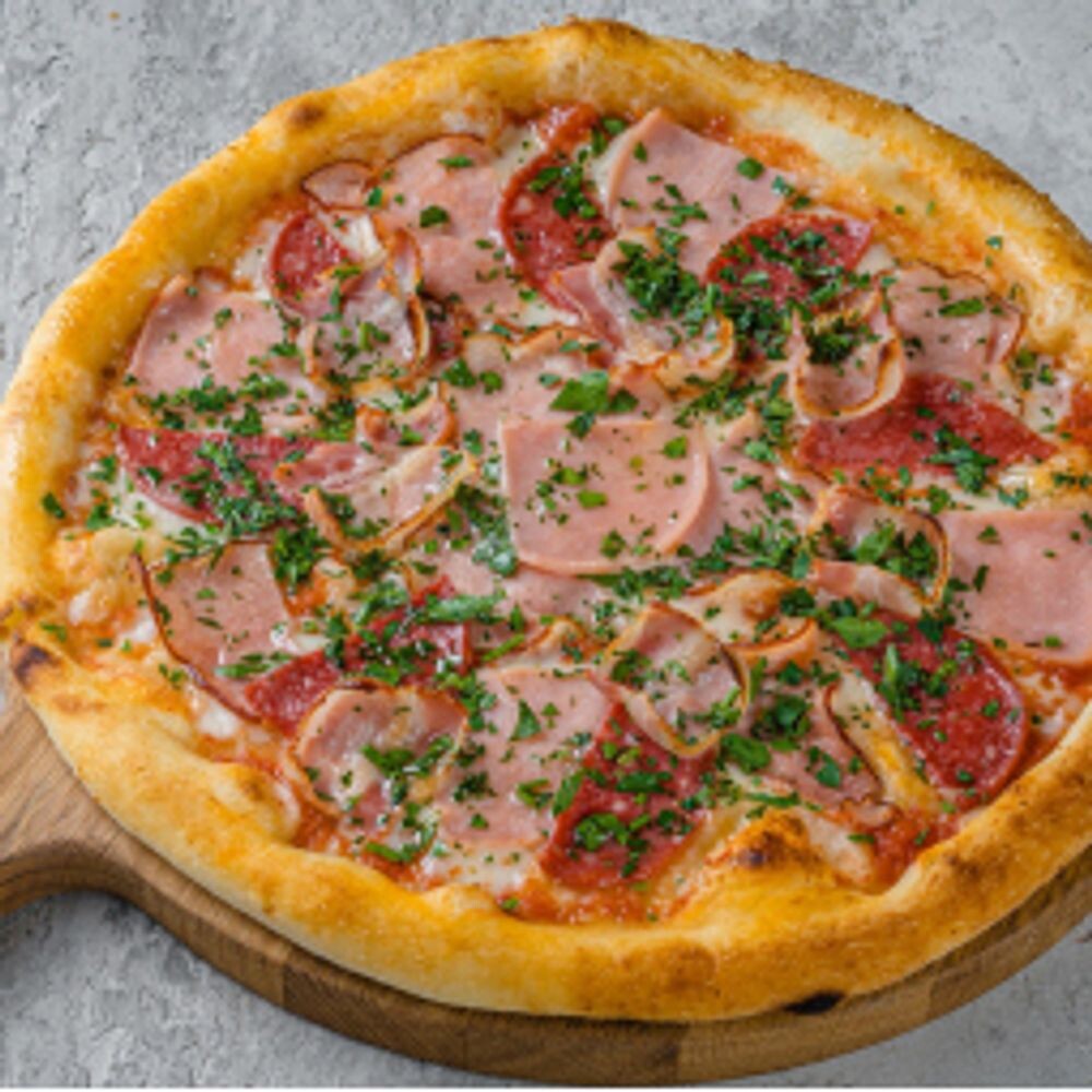 Ветчина, варено-копченый окорок, сырокопченый бекон, варено-копченая колбаса, моцарелла, соус из протертых томатов