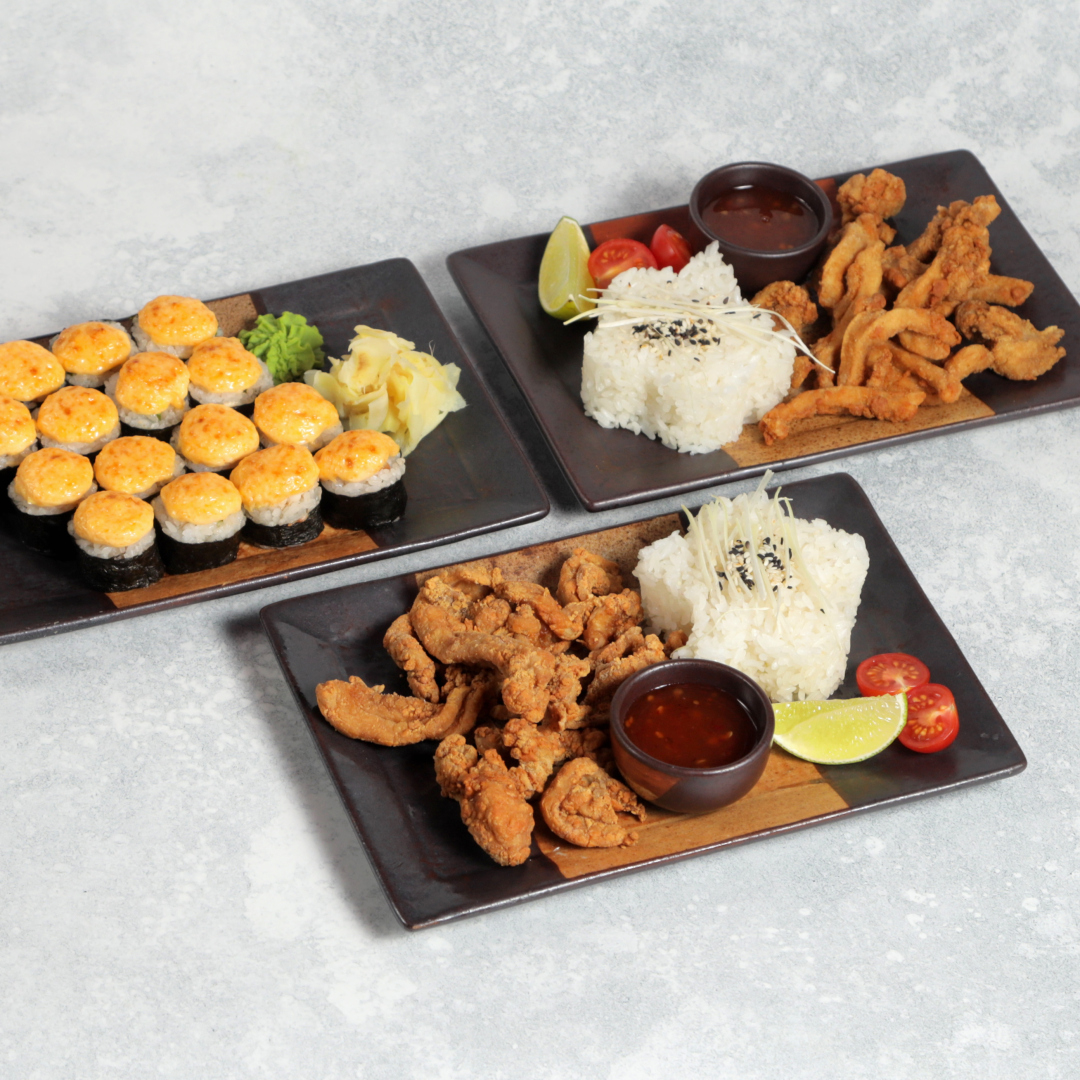 - Хрустящая курица с кисло-сладким чили соусом (2 порции): Филе куриного бедра, рис, черри, кисло-сладкий чили соус. Вес 570 г. - Запеченные роллы с копченой курицей (2 порции): Копченая курица, огурец, соус для запекания. Вес 370 г.