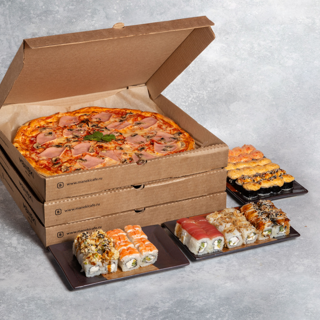 - Пицца ветчина и шампиньоны (большая): Ветчина, шампиньоны, сыр моцарелла, соус из протертых томатов, оливковое масло. Вес 600 гр. - Пицца Мясная (большая): Ветчина, варено-копченый окорок, сырокопченый бекон, варено-копченая колбаса, моцарелла, соус из протертых томатов. Вес 670 гр. - Пицца Карбонара (большая): Сырокопченый бекон, варено-копченый окорок, моцарелла, чесночный соус. Вес 650 гр. - Филадельфия с тунцом ( Тунец, авокадо, огурец, сливочный сыр ) Вес 215 гр. - Филадельфия с креветкой ( Креветки, авокадо, огурец, сливочный сыр ) Вес 215 гр. - Филадельфия с угрем ( Угорь, авокадо, огурец, сливочный сыр, соус терияки ). Вес 210 гр. - Бонито с сурими ( Сурими, огурец, сливочный сыр, стружка тунца ) Вес 190 гр. - С тартаром из креветки (Креветки, авокадо, сливочный сыр, зеленый лук, японский майонез, соусы: устричный, терияки ) Вес 190 гр. - Запеченный с копченой курицей ( Копченая курица, огурец, соус для запекания ) Вес 185 гр. - Запеченный с сурими ( Сурими, сливочный сыр, соус для запекания с тобико ) Вес 185 гр. - Запеченный с окунем и соусом терияки ( Окунь, сливочный сыр, соусы: для запекания, терияки ) Вес 185 гр.