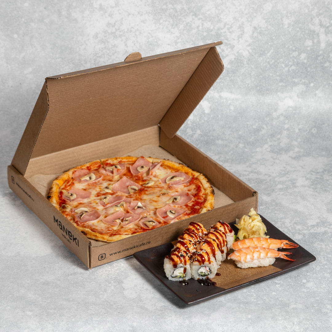 -Пицца ветчиной и шампиньонами (средняя): Ветчина, шампиньоны, сыр моцарелла, соус из протертых томатов, оливковое масло. Вес 600г. -Запеченные сливочные роллы с креветками: Креветки, сурими, огурец, сливочный сыр, соусы: для запекания с тобико, терияки. Вес 240г. -Суши с креветкой. Вес 60 г.