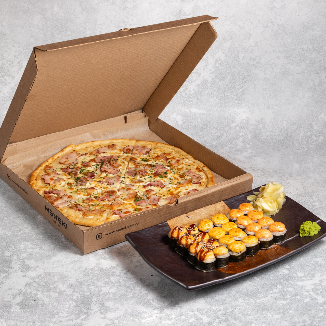 -Пицца Карбонара (большая): сырокопченый бекон, варено-копченый окорок, моцарелла, чесночный соус. Вес 650г. Запеченный ролл: - С копченой курицей: копченая курица, огурец, соус для запекания. Вес 185г - С сурими и тобико: сурими, сливочный сыр, соус для запекания с тобико. Вес 185г - С окунем и соусом терияки: окунь, сливочный сыр, соус для запекания, соус терияки. Вес 185г