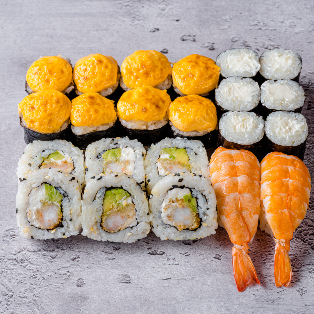 Запеченный с копченой курицей; Тоттори с креветками; Маки со сливочным сыром; Суши с креветкой (22 шт).