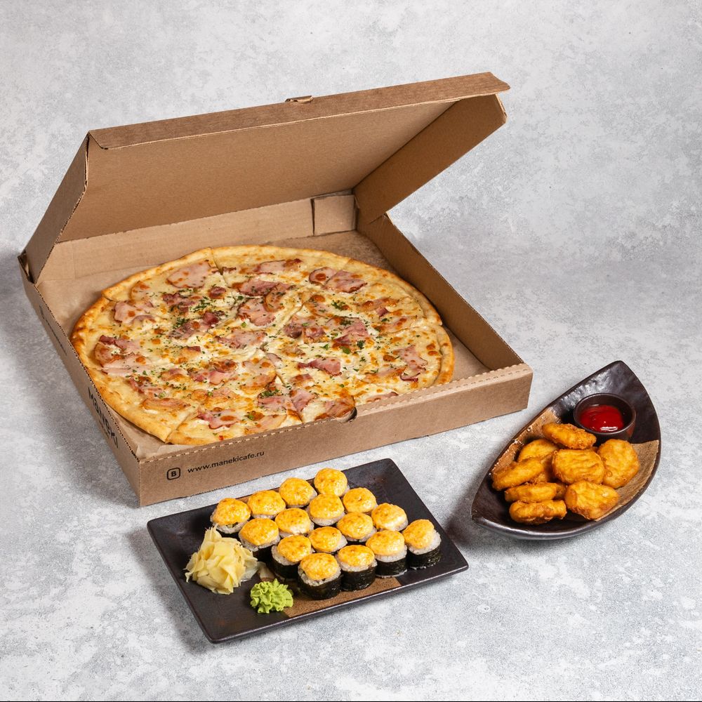 -Пицца Карбонара (большая): Сырокопченый бекон, варено-копченый окорок, моцарелла, чесночный соус. Вес 650г. -Запеченный ролл с копченой курицей (2 порции): копченая курица, огурец, соус для запекания. Вес 370г. -Наггетсы (10 штук): Вес 225г.