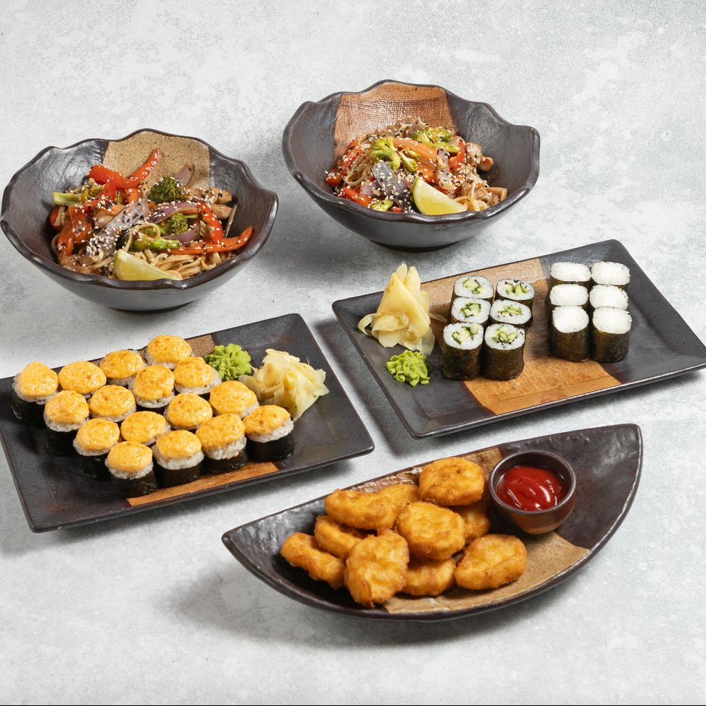 -Вок с курицей (2 порции): филе бедра, удон, брокколи, перец болгарский, морковь, лук красный, масло чесночное , соус кисло-сладкий чили. Вес 720г -Запеченный ролл с копченой курицей (2 порции):копченая курица, огурец, соус для запекания. Вес 370г. -Ролл со сливочным сыром: Вес 100г. -Ролл с огурцом: Вес 100г. -Наггетсы (10 штук): Вес 225г.