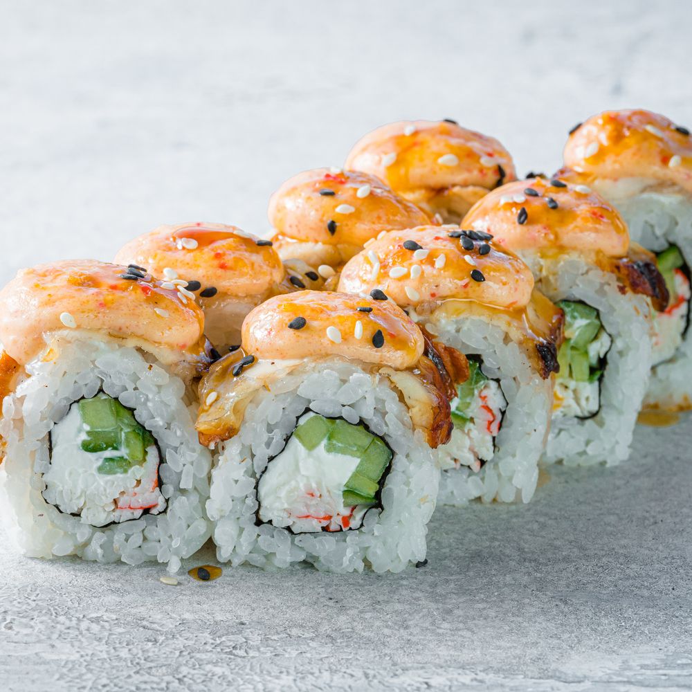 Угорь, сурими, огурец, сливочный сыр, соусы: для запекания с тобико, терияки