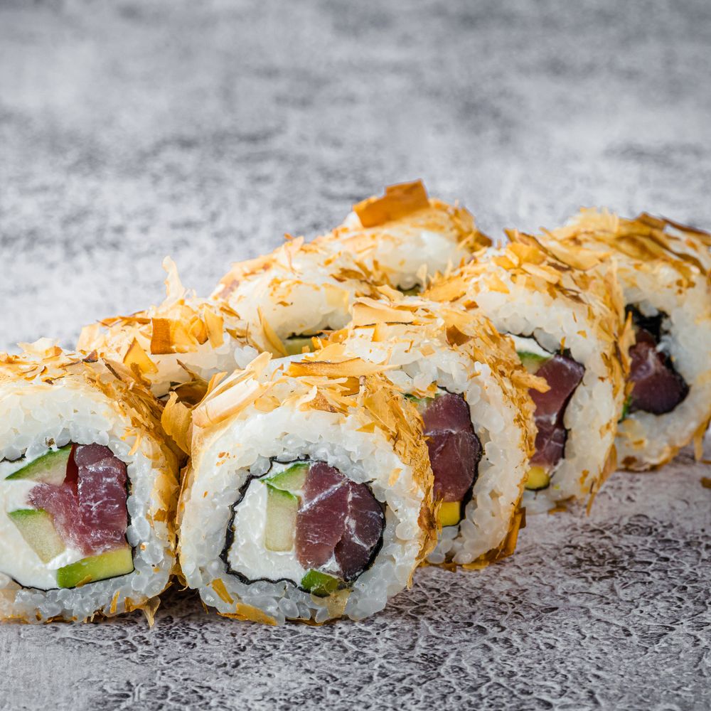 Тунец, авокадо, огурец, сливочный сыр, стружка тунца