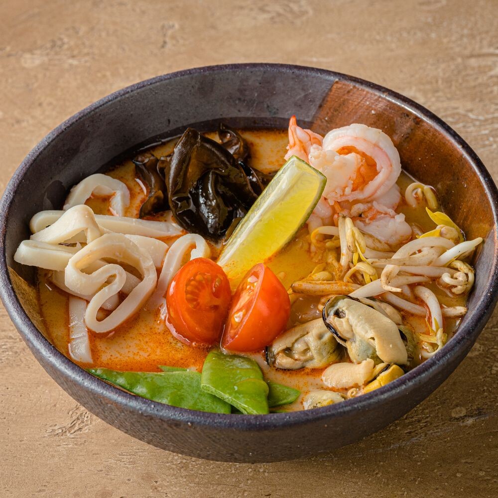 Креветки, мидии, кальмар, соевые ростки, стручковый горох, муэр, черри, бульон на основе кокосового молока