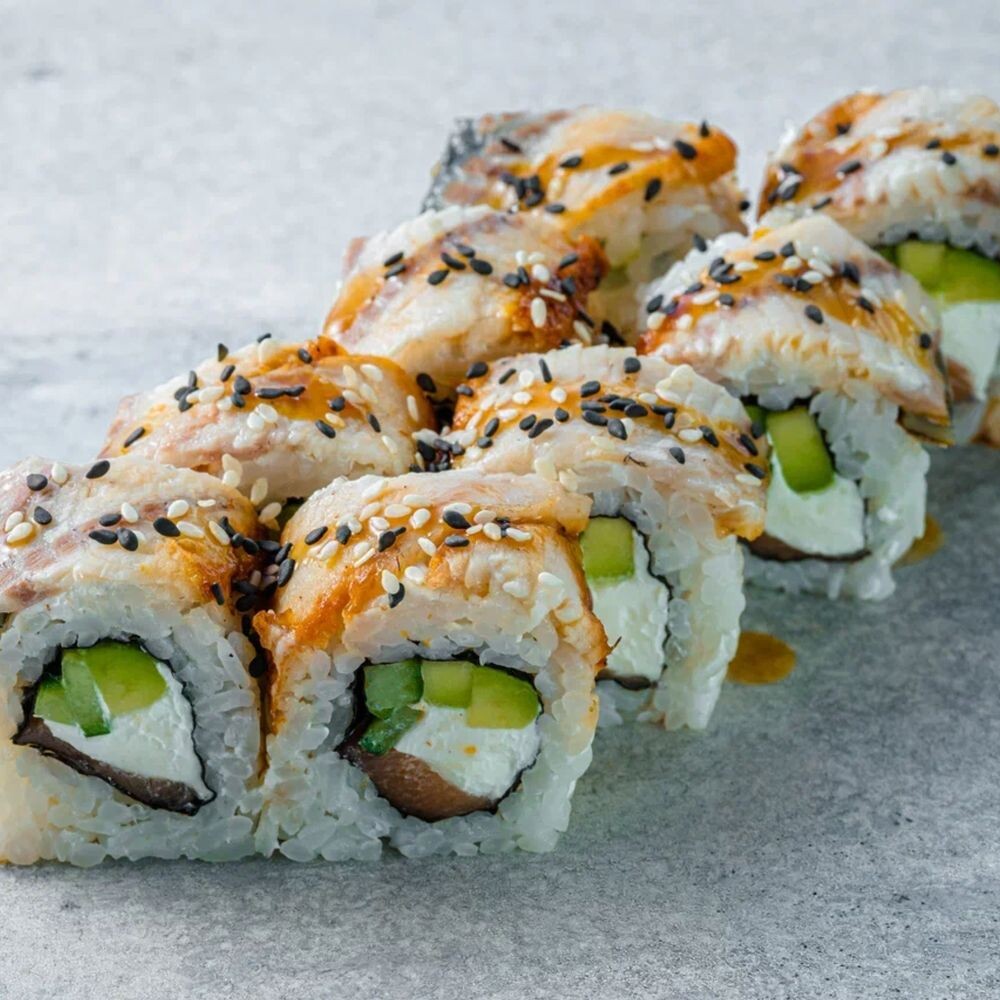 Лосось, угорь, авокадо, огурец, сливочный сыр, соус терияки
