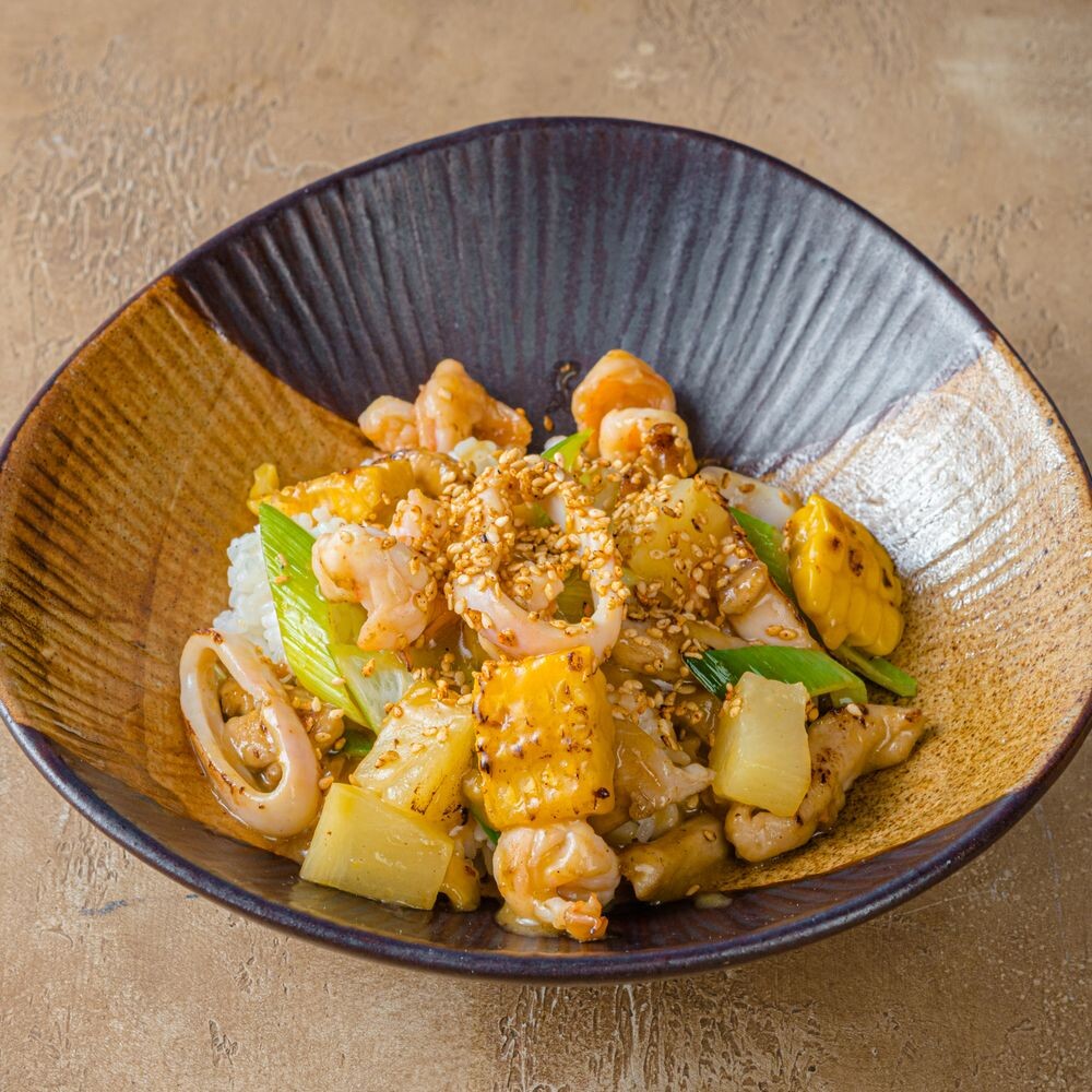 Креветки, кальмар, филе куриного бедра, консервированный ананас, кукуруза, лук порей, рис, манговый соус