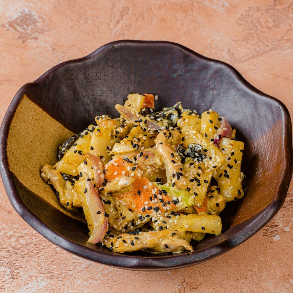 Филе куриного бедра, ттокпокки, морковь, болгарский перец, кабачки, муэр, красный лук, сливочный соус карри