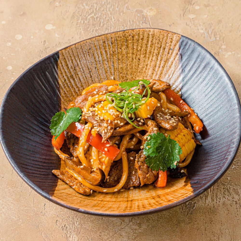 Говядина, японский удон, болгарский перец, кукуруза, шиитаке, кинза, соус габаджоу