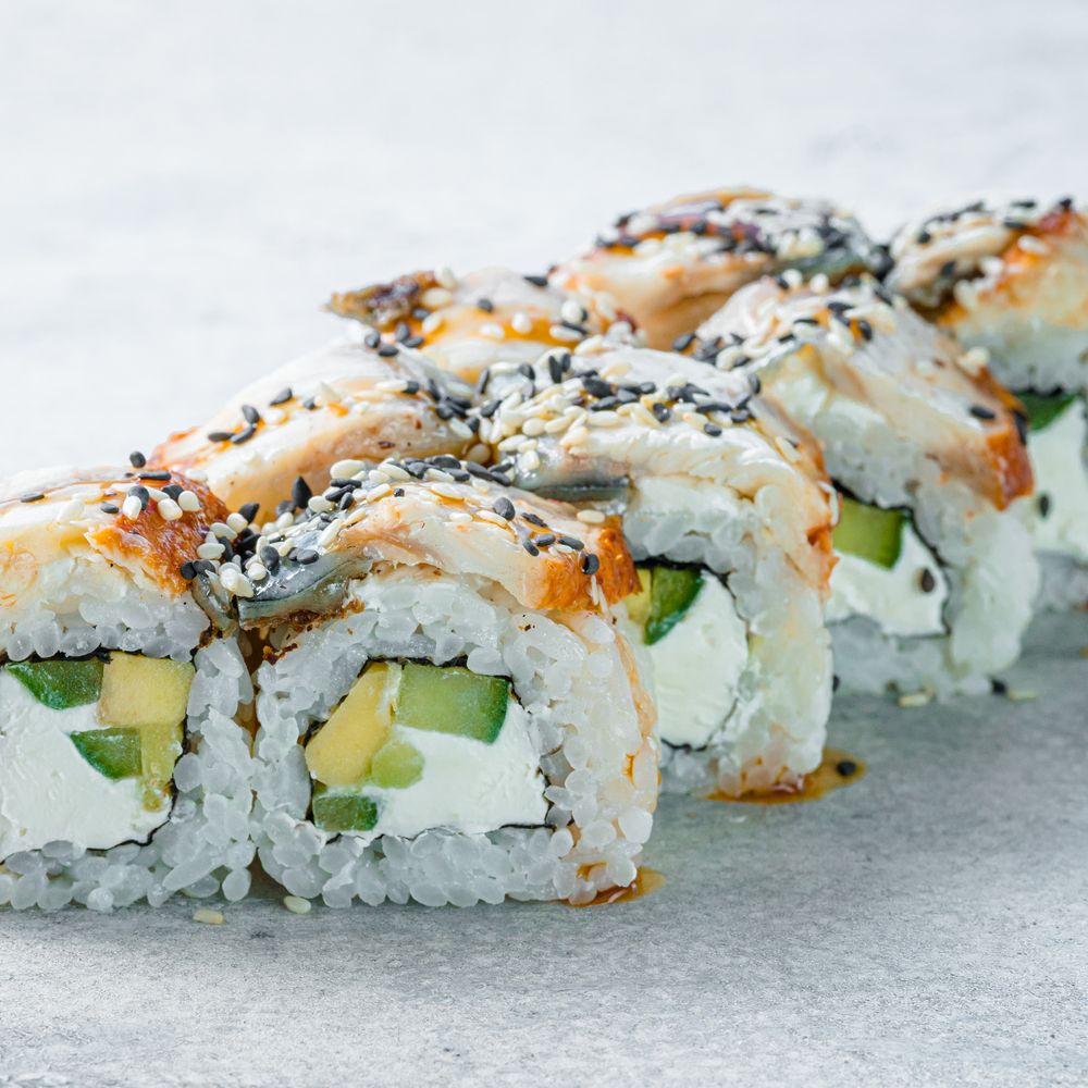 Угорь, авокадо, огурец, сливочный сыр, соус терияки